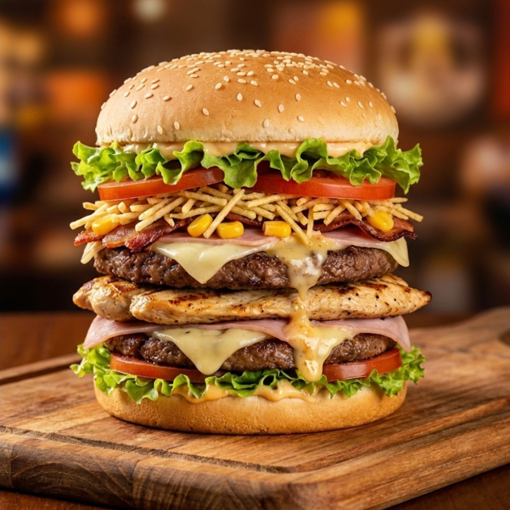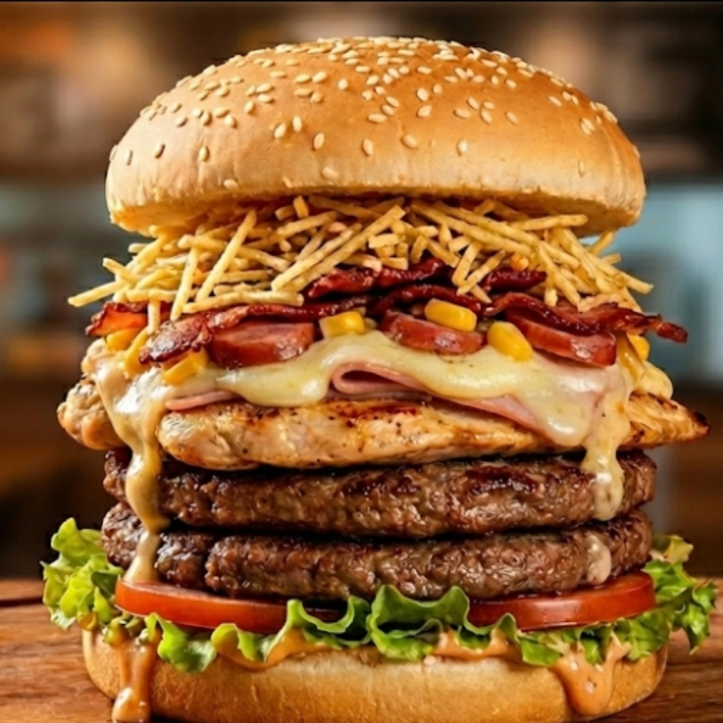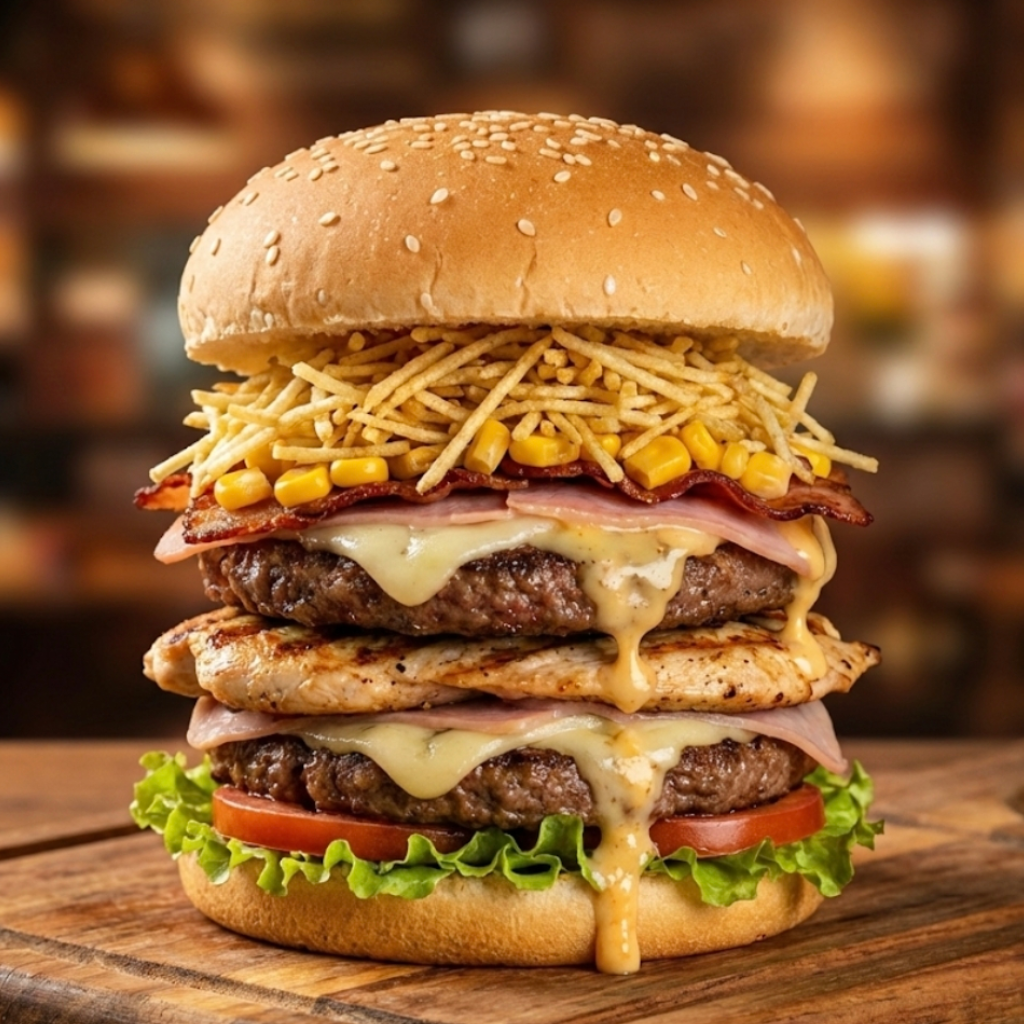 Pão, 2 hambúrgueres, filé frango, bacon, milho, batata palha, alface, salsicha, tomate, presunto e mussarela.