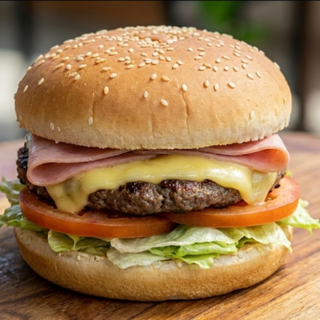 Pão, hambúrguer, alface, tomate, presunto e mussarela. Acompanha ketchup sachê.