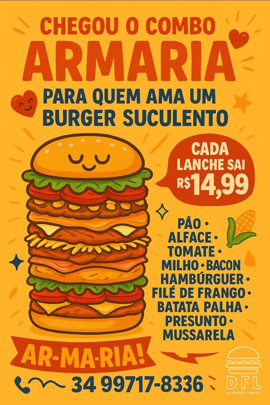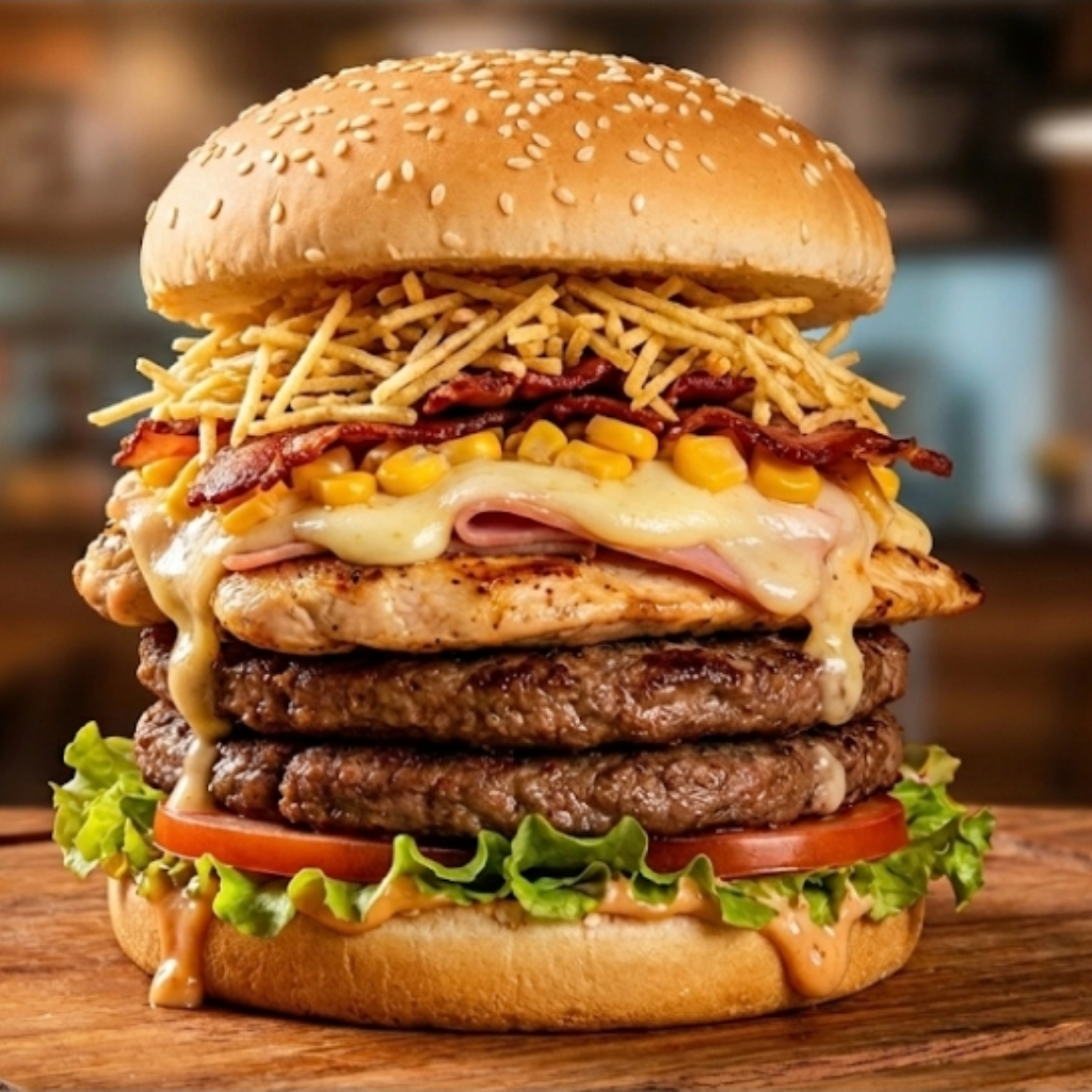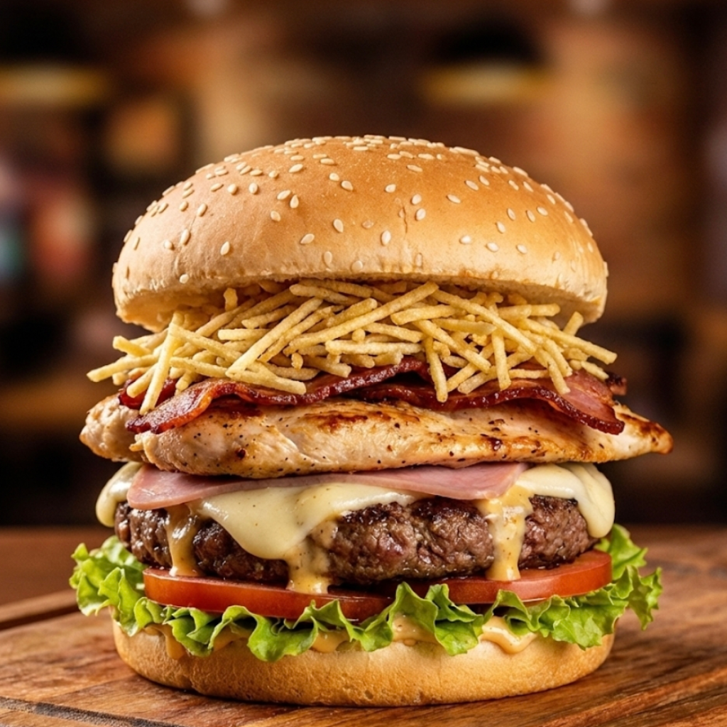 Pão, hambúrguer artesanal, filé de frango, bacon, milho, batata palha.