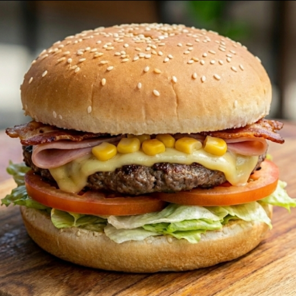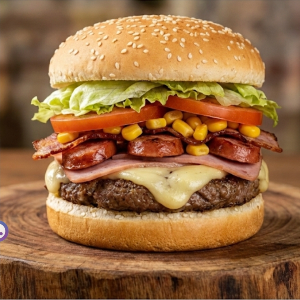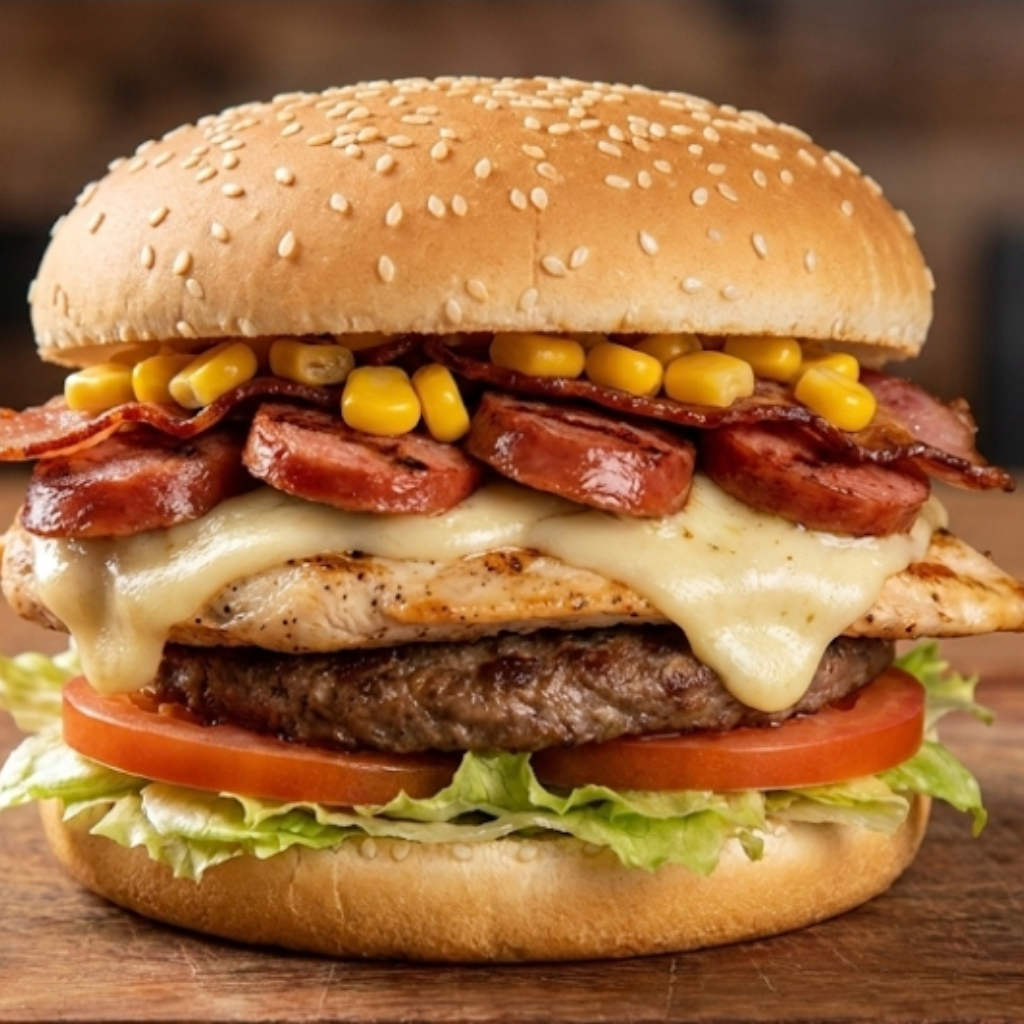 Pão, hambúrguer, milho, bacon, alface, tomate, presunto e mussarela.