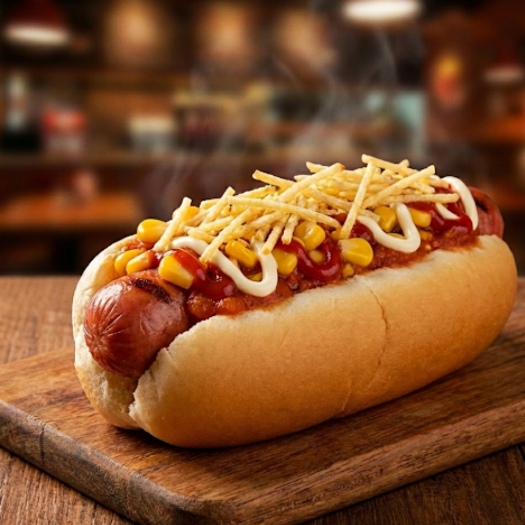 Pão, molho, 2 salsichas, milho, batata palha, bacon, vinagrete, ketchup e maionese.
