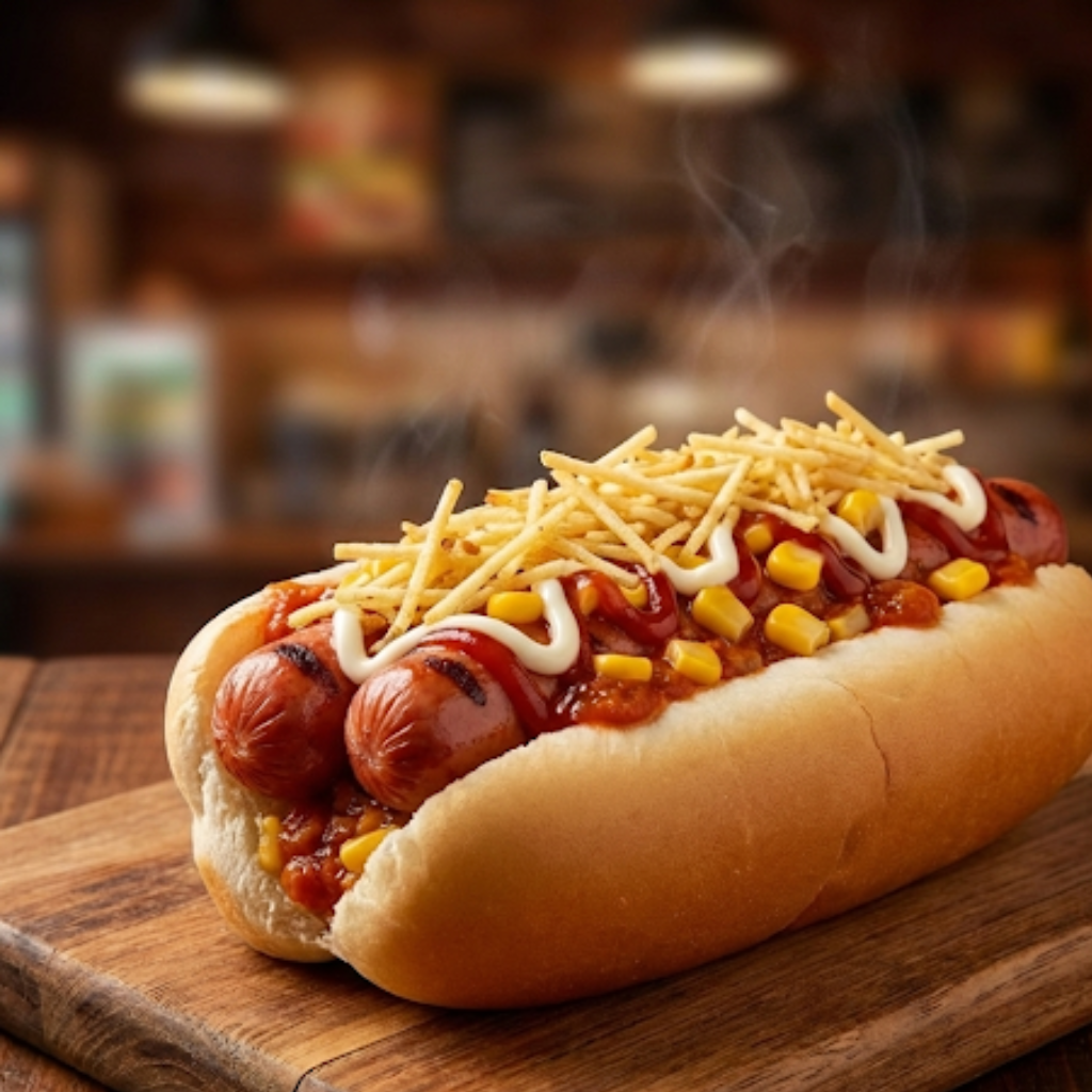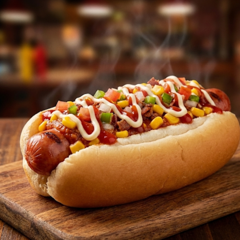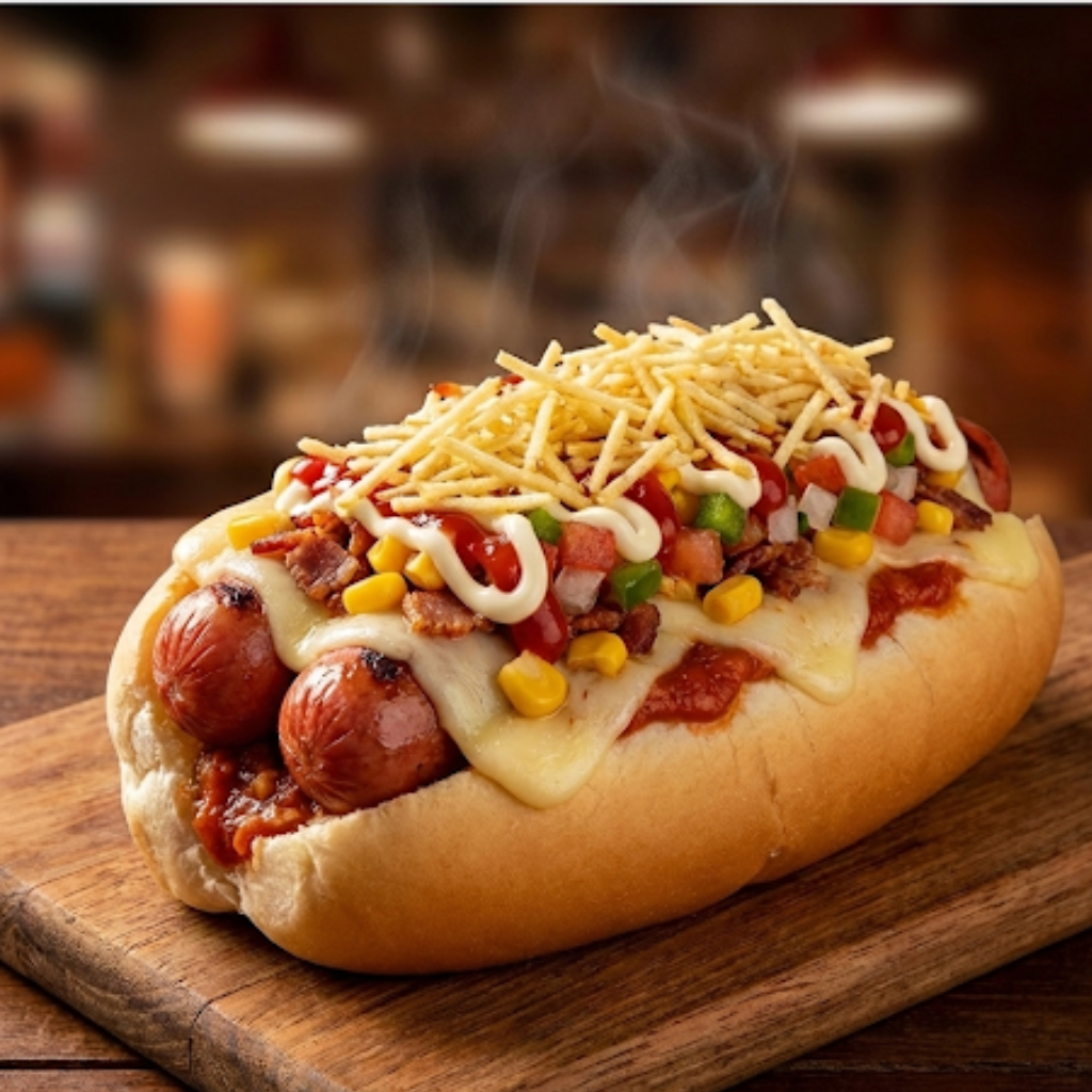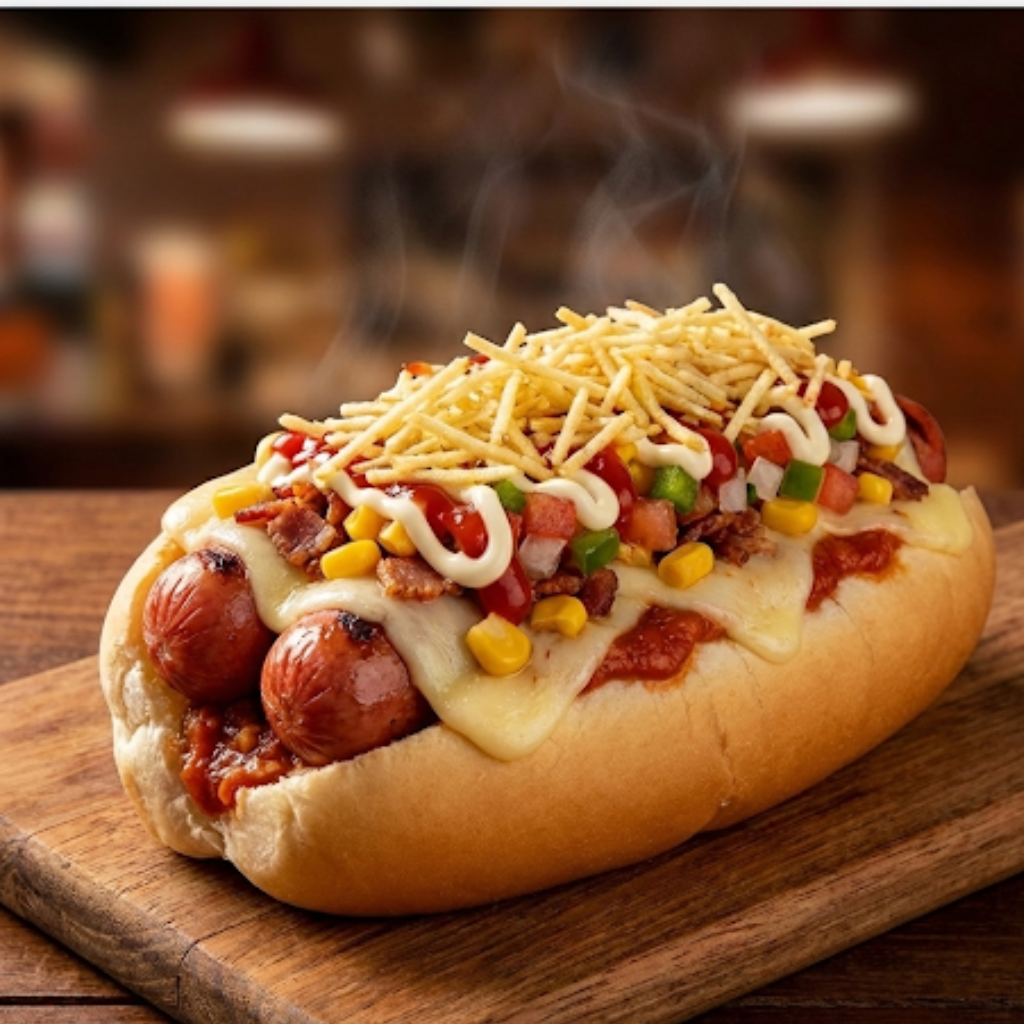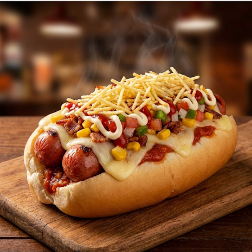 Pão, molho, 2 salsichas, milho, batata palha, bacon, vinagrete, mussarela, ketchup e maionese.